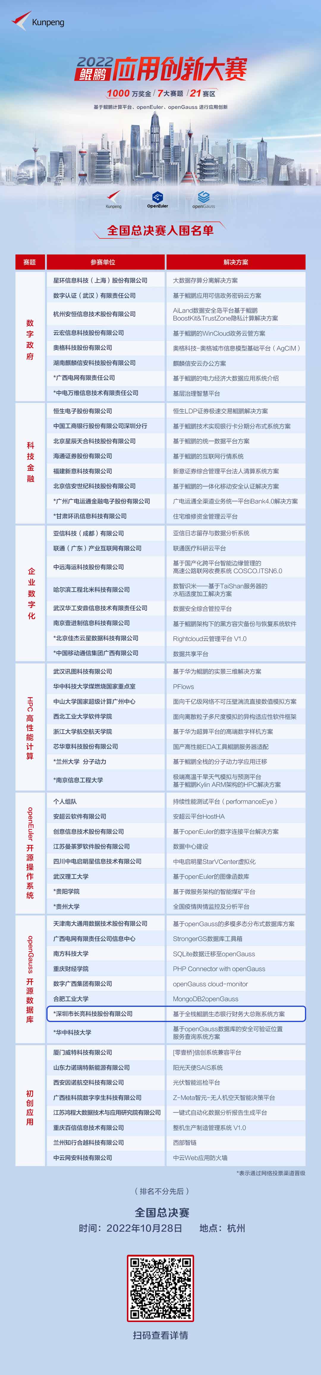 深圳賽區自正式啟動以來,不乏很多的業界知名企業參與其中。經過激烈的角逐競爭,及大賽組委會專家綜合評審,從方案創新性、技術領先性、商業前景性及社會價值四個維度出發,最終有56支晉級團隊從900+支隊伍中脫穎而出,而長亮科技憑借基于全棧鯤鵬生態銀行大總帳系統方案在openGauss開源數據庫賽道中一舉奪魁,榮獲深圳賽區第一名,順利晉級全國總決賽!