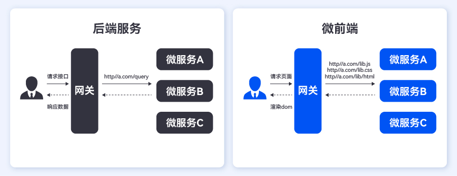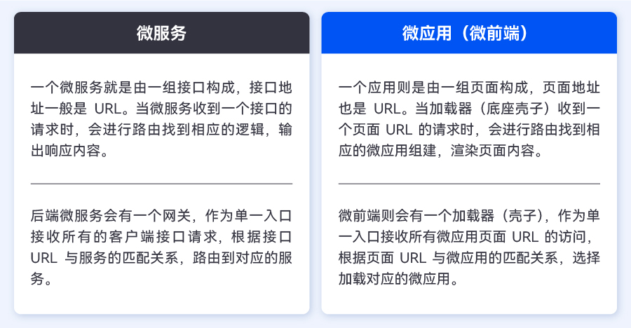 通過跟微服務進行對比,我們可以更清晰地理解微前端的概念: