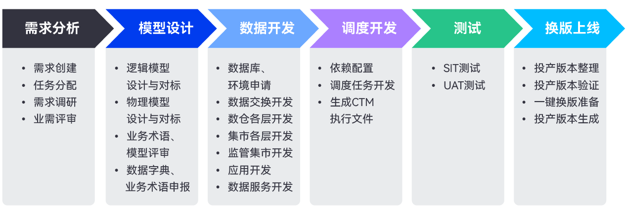 該平臺打通了數(shù)據(jù)研發(fā)運維從需求到上線的多個關(guān)鍵環(huán)節(jié),通過敏捷需求管理、模型設(shè)計即治理、全開發(fā)場景支持、自動化單元測試、一鍵提測與發(fā)布、全面需求監(jiān)控的全鏈路智能化管控,確保數(shù)據(jù)開發(fā)全過程的順暢與協(xié)同。
