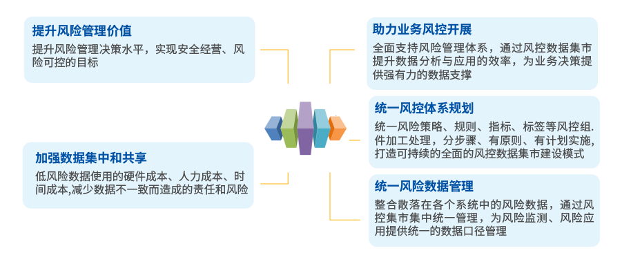 通過搭建全行級風險集市,整合內外部數據,加強數據集中管理和共享,進行統一風險策略、指標和標簽加工處理,提升數據分析與應用的效率,為業務決策提供強有力的數據支撐,全面支持風險管理體系。