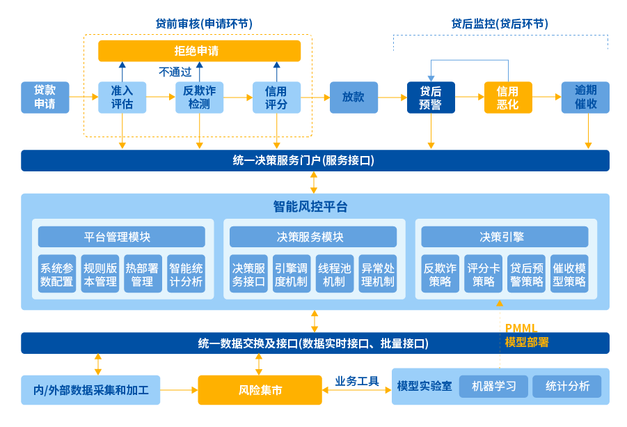 在信貸全流程中對客戶進行反欺詐識別、準入判斷、綜合評分、貸后預警和催收等風險決策管控,能夠對貸款風險進行事前、事中和事后的全程監控,有效地評估和管控貸款業務開展過程中的信用風險、操作風險和道德風險,還可通過數據分析、規則篩選、模型匹配等平臺決策支持能力加強貸前貸中的審批管理,實現貸后的差異化管理,為銀行建立完善信貸風險的評估機制和管控機制。
