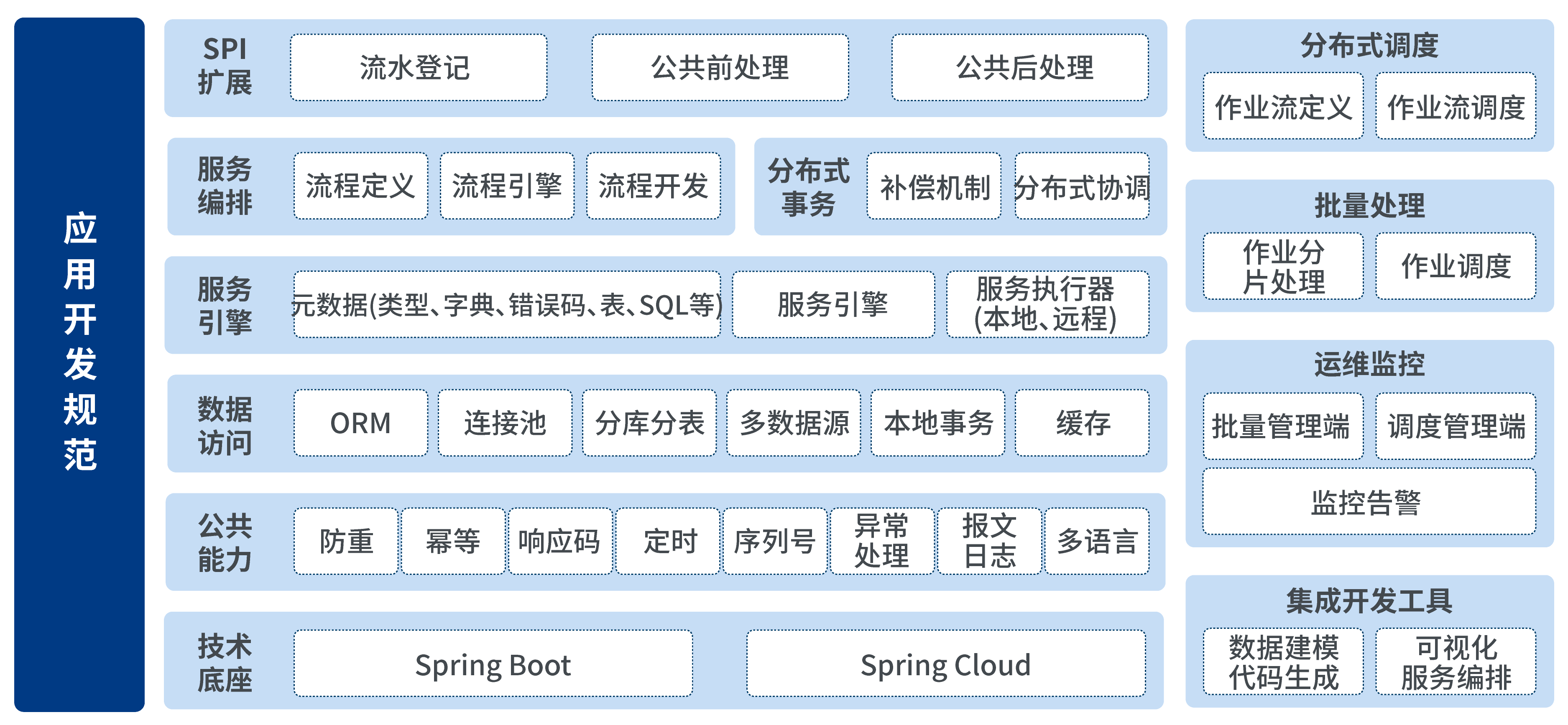 新一代金融應用平臺總體架構由聯機引擎(服務引擎、服務編排、分布式事務、元數據等)、批量引擎(分布式調度、批量處理)、公共能力(防重、冪等、序列號、數據訪問、SPI機制、技術底座等)、開發工具和開發規范組成。