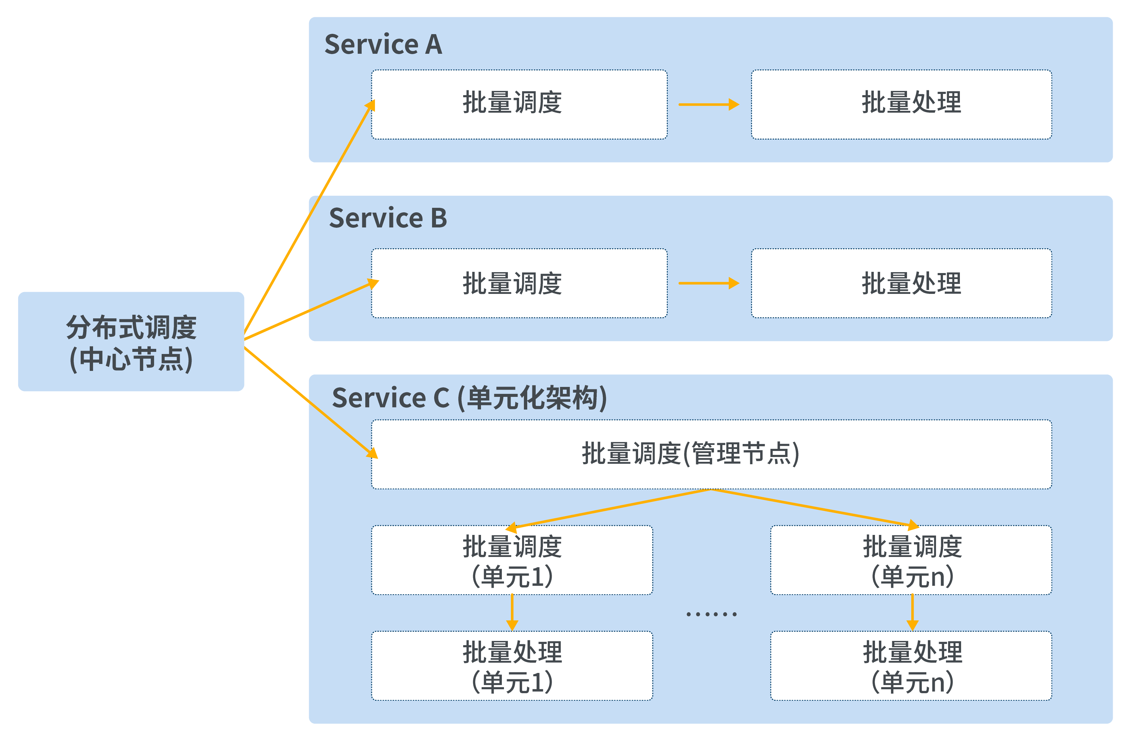 在復雜架構(微服務+單元化)下,分布式調度需要支持去中心化調度能力,以降低主節點的調度壓力,將調度分散到每個微服務,每個單元處理。