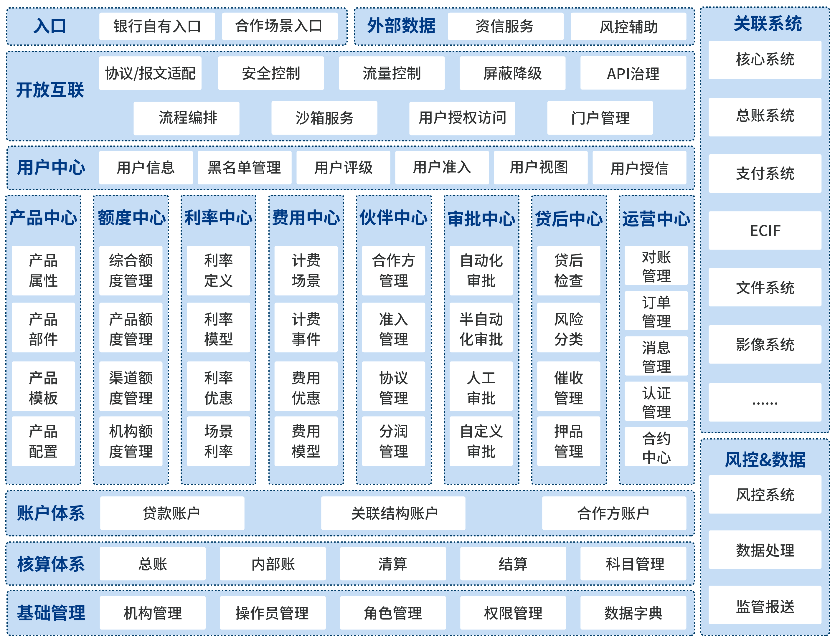 支持引入渠道合作方和消費(fèi)融資類場(chǎng)景,打造客戶和商戶的快速融資產(chǎn)品。基于交易信息和商圈的“信用評(píng)價(jià)體系”,通過(guò)接入大數(shù)據(jù)實(shí)現(xiàn)自動(dòng)授信、在線營(yíng)銷、快速融資&風(fēng)控&放貸,隨時(shí)隨地為客戶提供全面的融資服務(wù)。