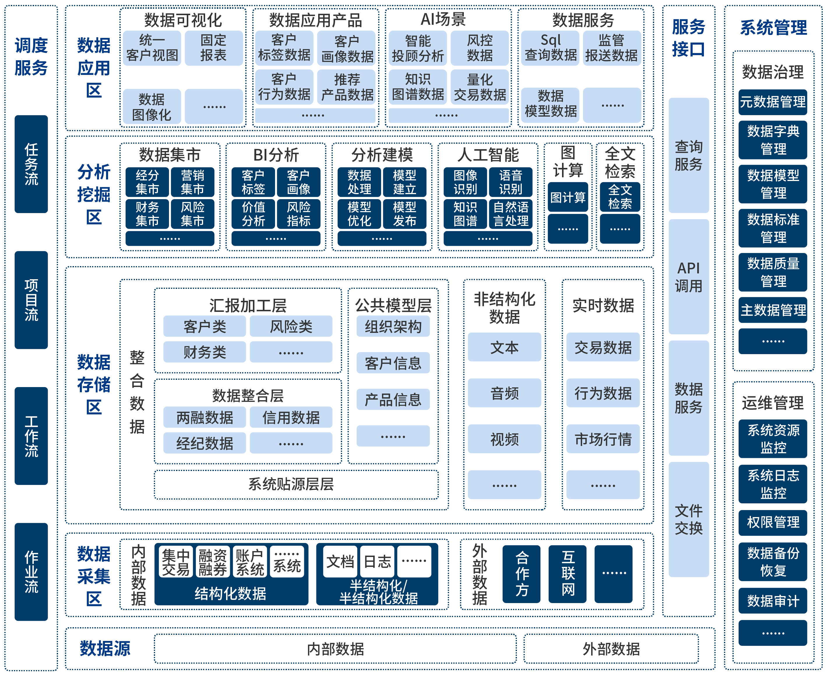 隨著證券行業(yè)大環(huán)境的變化,證券公司為實現(xiàn)業(yè)務戰(zhàn)略轉型、業(yè)務變革與創(chuàng)新發(fā)展,對數(shù)據(jù)的分析、應用提出了更高的要求。基于大數(shù)據(jù)平臺,可有效整合企業(yè)內外部數(shù)據(jù)信息,構建金融科技基礎能力,為證券公司業(yè)務拓展提供數(shù)據(jù)應用、數(shù)據(jù)分析、數(shù)據(jù)洞察決策等敏捷支撐。